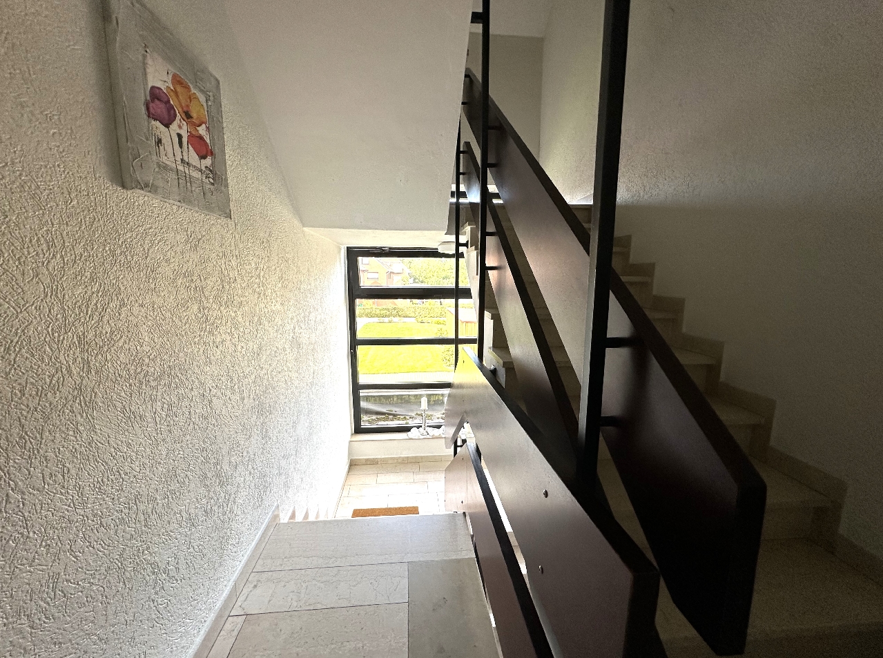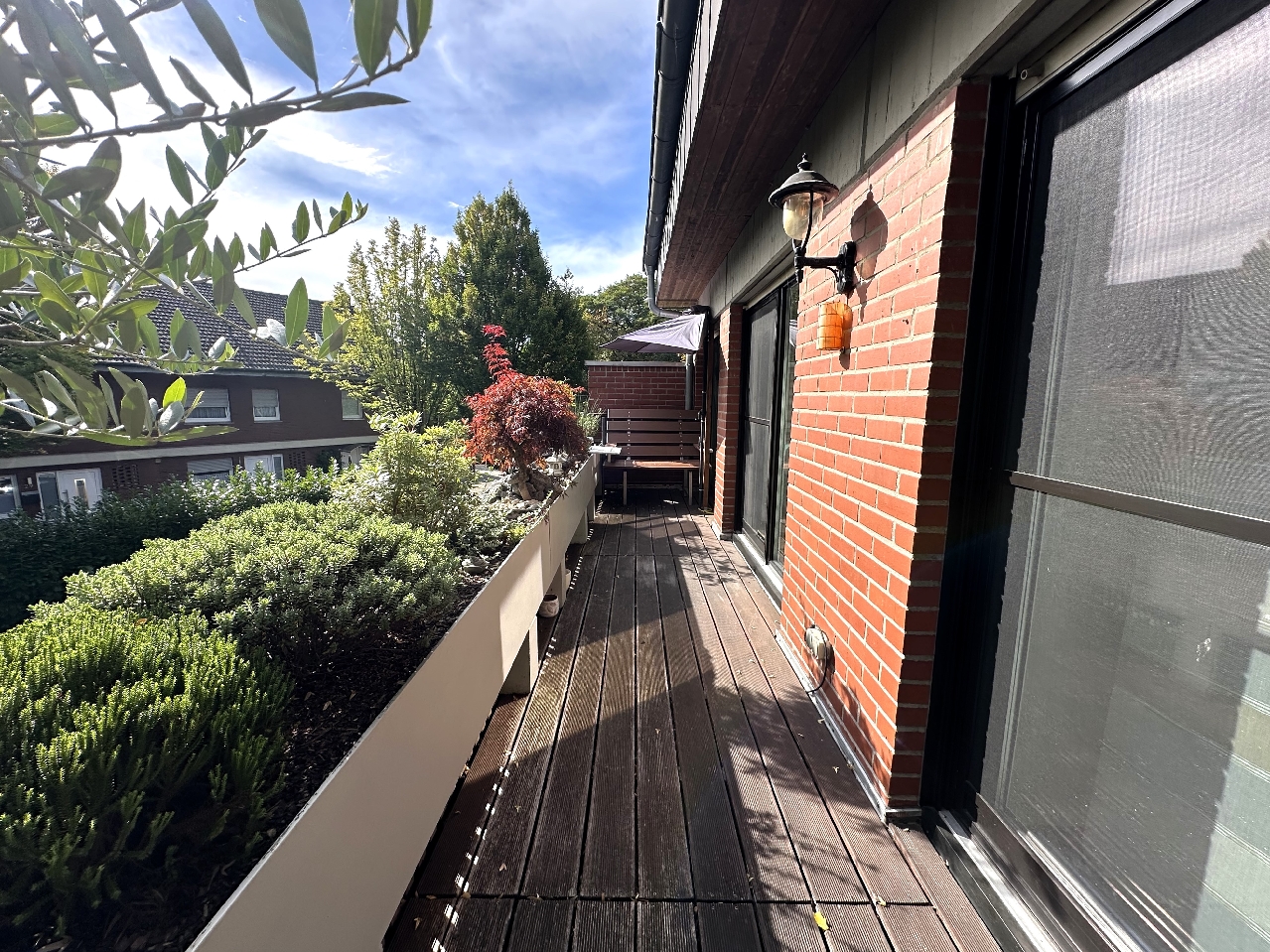 Alle Fenster wurden in 2006 erneuert und haben nun Dreifachverglasung. Die Fenster sind mit Außenjalousien ausgestattet, die teilweise elektrisch gesteuert sind. Die große Loggia ist über das Wohnzimmer und das Elternschlafzimmer zugänglich. Beide Türen sind mit zusätzlichem Fliegenschutz versehen. Auf der Loggia können Sie ausgiebig die Sonne genießen und profitieren zudem von der ruhigen Sackgassenlage.