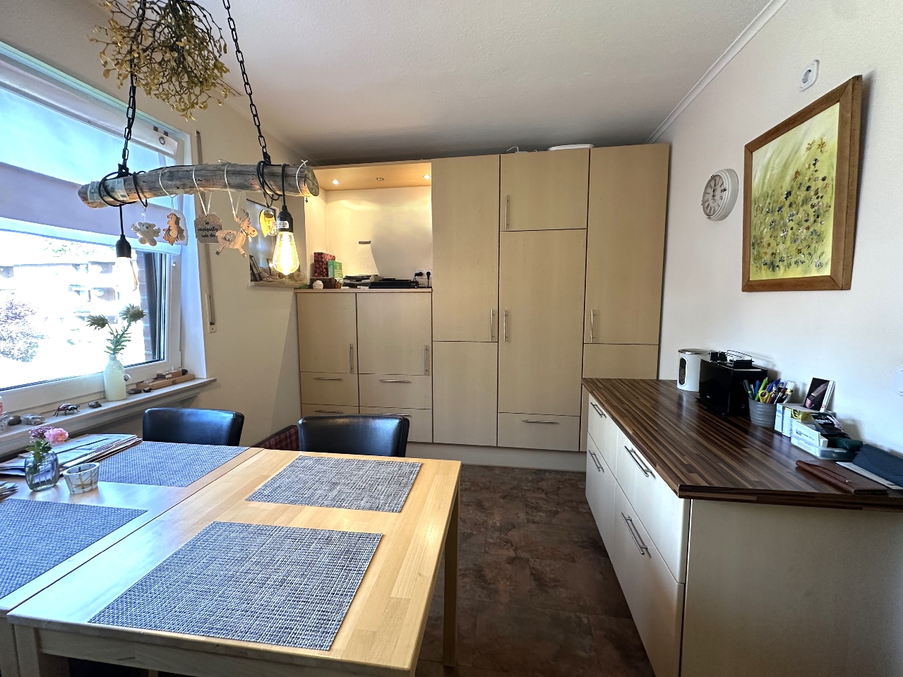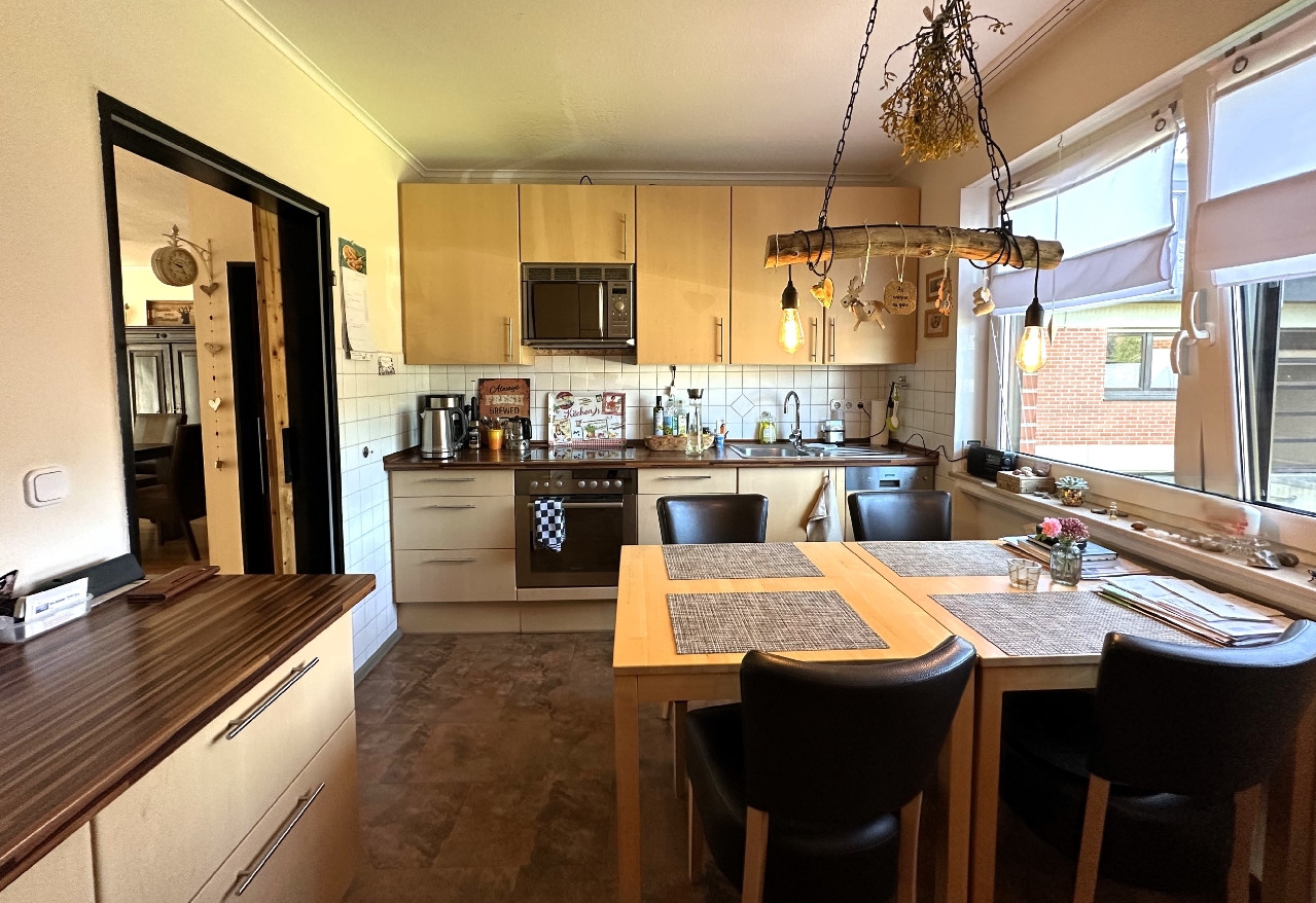 Die große Küche ist mit einer Einbauküche ausgestattet und bietet auch genügend Platz für einen Essplatz. Durch eine praktische Schiebetür gibt es eine gute Verbindung zum Wohn-/Essbereich.