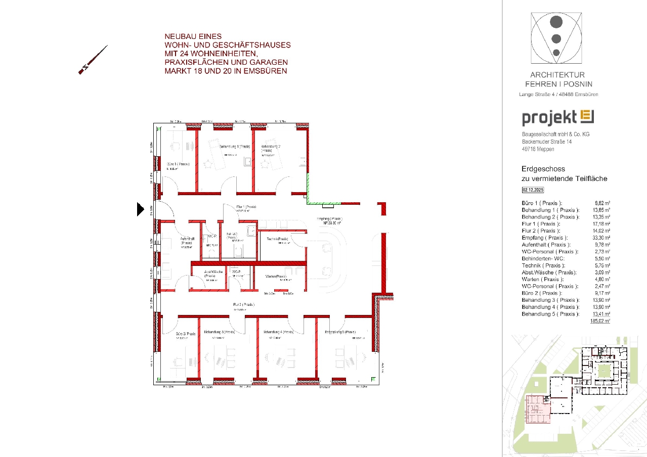 In absolut zentraler Lage von Emsbüren entsteht dieses moderne Wohn- und Geschäftshaus. Das gesamte Erdgeschoss wurde von den Inhabern einer ortsansässigen Praxis für Physiotherapie und Krankengymnastik erworben, die dort auch einen Reha-Sport – und Fitnessbereich anbieten werde. Eine Teilfläche des Erdgeschosses steht zur Vermietung. Die Teilfläche hat eine Gesamtgröße von ca. 185 m² und verfügt über einen eigenen Eingang. Bevorzugt ist die Fläche für Unternehmen gedacht, die ebenfalls im Gesundheitsbereich tätig sind und eine gute Ergänzung zur Physiontherapiepraxis wären. Die Fläche könnte auch geteilt werden und von mehren Unternehmen gemeinsam genutzt werden.
